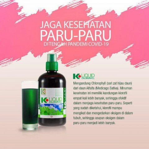 K-Liquid Chlorophyll adalah minuman kesehatan yang bahan utamanya berasal dari daun Alfalfa (Medicago sativa) – “Bapak dari semua makanan-“. Daun-daun herbal ini bernilai nutrisi tinggi dan dengan bantuan proses ekstraksi modern, sari klorofil diekstrak dari daun Alfalfa.