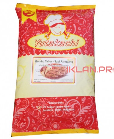 Bumbu Tabur Sapi Panggang Yutakachi merupakan bumbu tabur kualitas 1 dengan rasa Sapi Panggang yang kuat dan khas, warna orange dan ukuran partikel bumbu yang halus sehingga lebih merata bila ditaburkan serta lebih hemat penggunaannya. Bumbu Tabur Sapi Panggang Yutakachi sangat praktis untuk digunakan sebagai bumbu tabur pada makanan, seperti kentang goreng, jagung bakar, kerupuk, keripik, snack, dll.